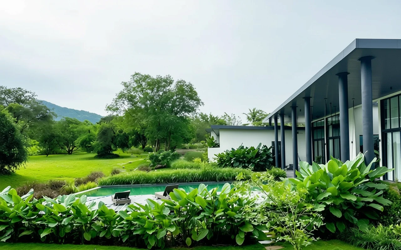 As you wander along meandering pathways, the lush greenery, curated gardens, and majestic trees reveal themselves gradually, each turn offering a new perspective, a moment to pause and breathe. The pool, framed by the mountains, reflects the sky and the surrounding landscape, creating a quiet sanctuary for reflection. Nearby, the dining area sits nestled between verdant lawns and grand trees, inviting you to enjoy meals immersed in nature, whether it’s a family gathering, a celebration, or a quiet moment alone.