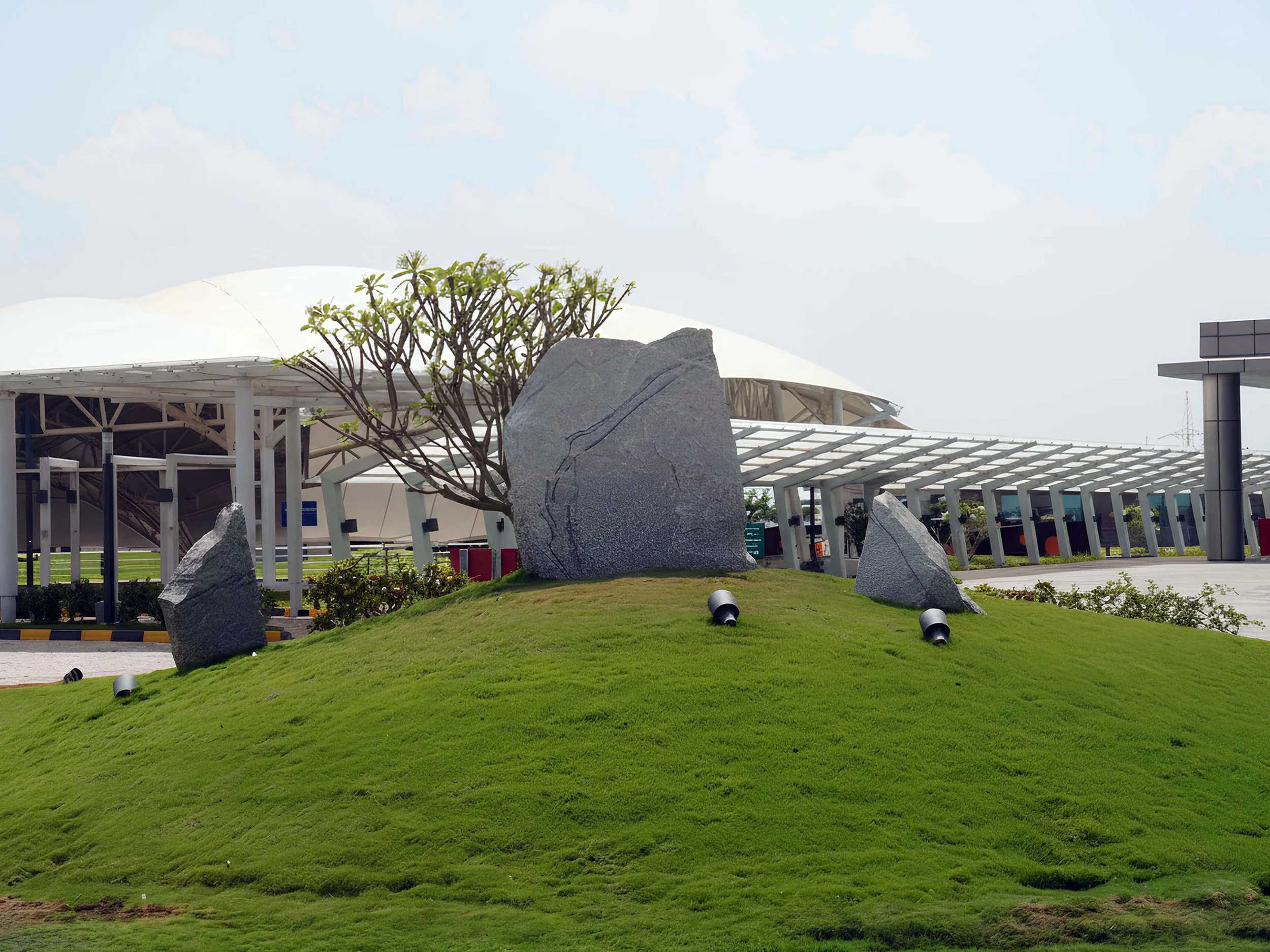 This campus caters to the South East Asian region, and its design draws inspiration from the rich cultural essence of the area. The central courtyard serves as a calming retreat within a disciplined work environment, acting as a natural stress reliever. The guiding principle, “Colours of the East,” is reflected in every design detail, celebrating vibrancy and harmony. The execution was carried out with meticulous precision, achieving a result true to the CGI vision. A hand-picked and finely chiseled rock marks the entry — an abstract form inviting each onlooker to interpret it through their own imagination.